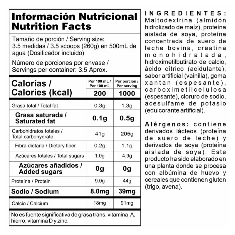 Megaplex Special Edition, es la mejor proteína hipercalórica de suero de leche con caseína, que incluye en su innovadora fórmula, 44 g de Proteína, 3.000 mg de Creatina Monohidrato, 500 mg de HMB, BCAA y 1.000 calorías por porción y fuentes de carbohidratos con diferentes velocidades de absorción. La Edición Limitada está compuesta 100% por proteínas lácteas y no contiene azúcares adicionados. Además, Incluye 21% más de contenido para que disfrutes su delicioso sabor a Cookies & Cream.