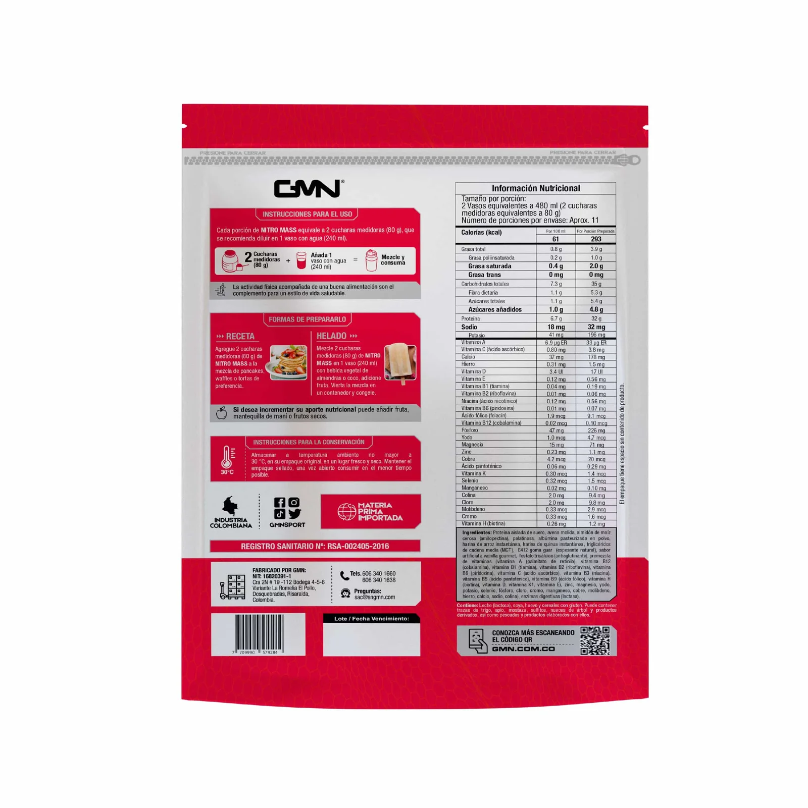 Mezcla en polvo a base de proteína aislada de suero de leche para preparar bebida, sin colorantes adicionados, sin azúcar añadido y sin conservantes con avena molida, almidón de maíz ceroso (amilopectrina), palatinosa, harina de arroz, harina de quinua y MCT (triglicéridos de cadena media), con sabor artificial a Vainilla gourmet.